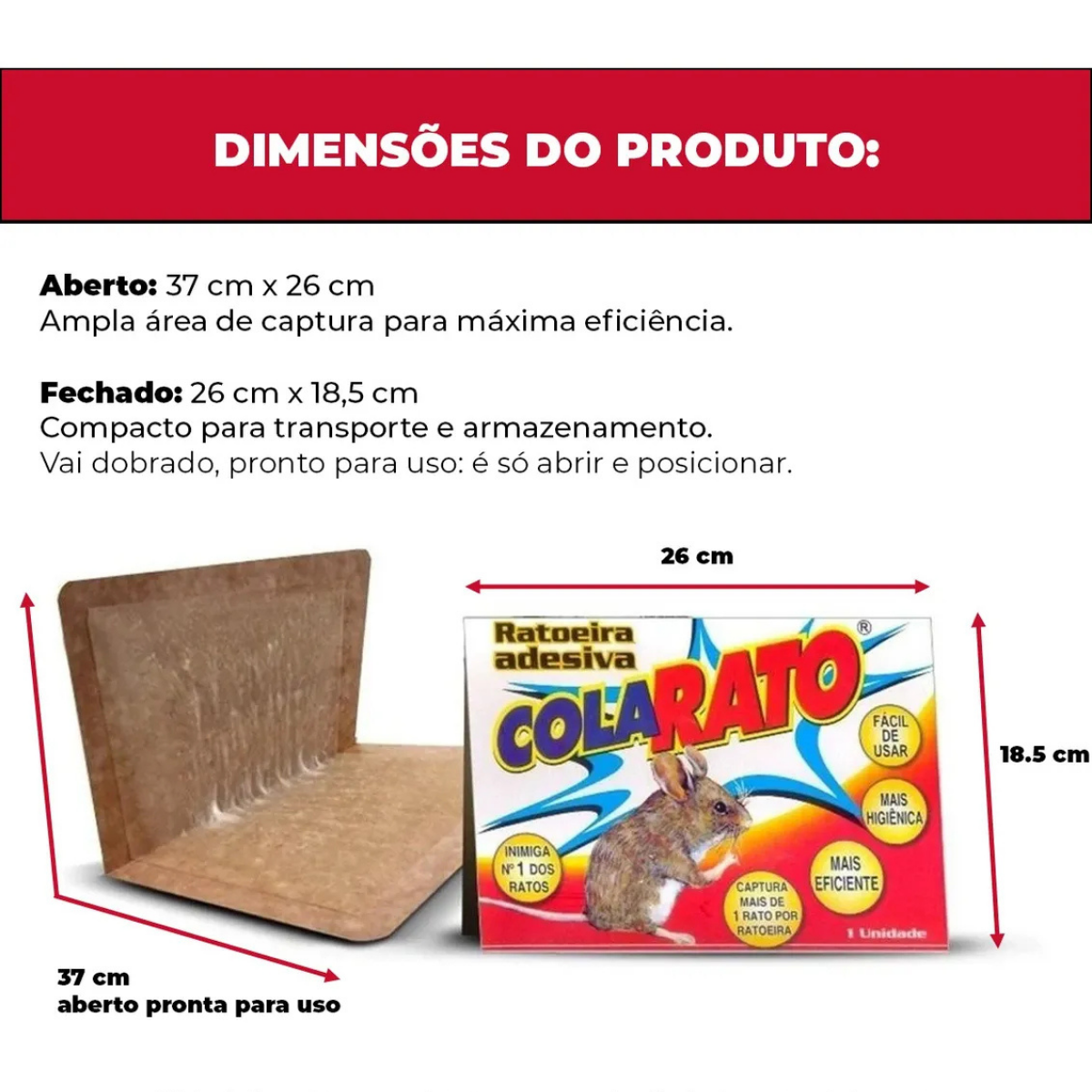 Cola Rato é uma armadilha adesiva que não resseca, possui ação instantânea e está pronta para o uso. Captura ratos e camundongos através do alto poder de fixação de sua cola. Pode ser utilizado em qualquer tipo de ambiente. Produto sem veneno.