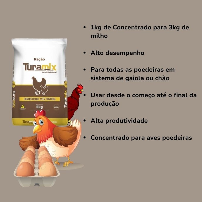 O Concentrado para Aves de Postura 5Kg - Turamix é produzido com as mais nobres matérias primas do mercado e atende aos mais exigentes requisitos de produção. Indicado para aves de postura, o Concentrado para Aves de Postura 5Kg - Turamix garante produtividade, sanidade e resultados ao produtor.