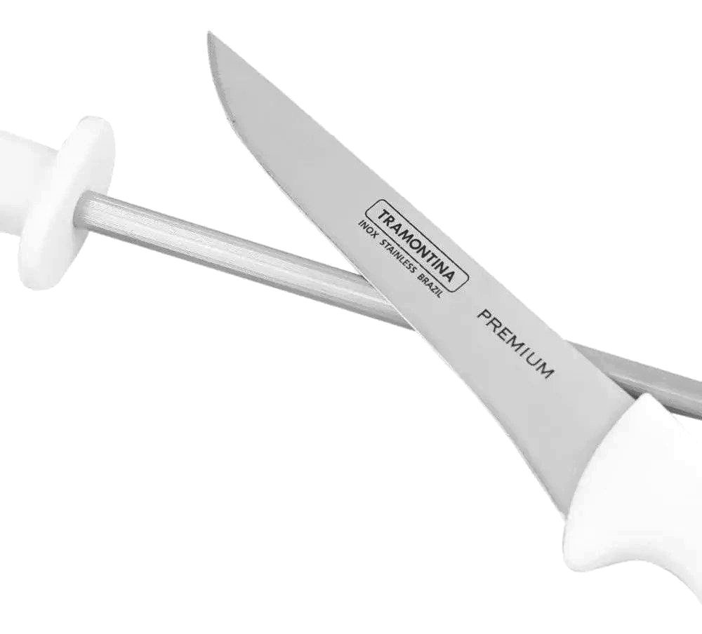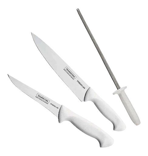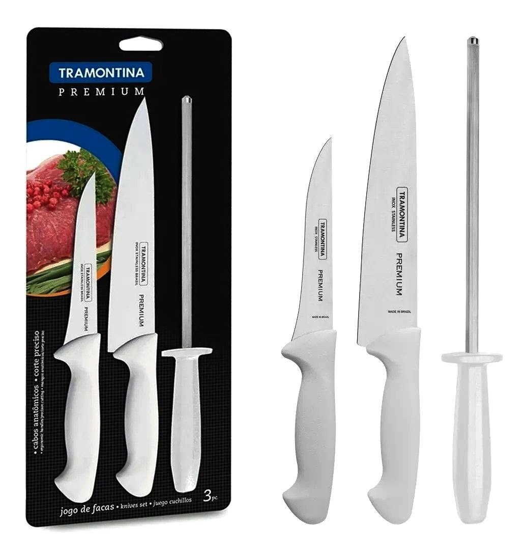 Para quem se arrisca na cozinha, ou mesmo para os mais experientes, o Jogo de Facas Tramontina Premium com Lâminas em Aço Inox e Cabos de Polipropileno Branco com Chaira 3 Peças é um item essencial. Com ele, o corte dos alimentos é facilitado pelo fio de alta durabilidade devido ao tratamento térmico aplicado nas lâminas de aço inox. A linha Premium pode ser lavada na máquina de lavar louças e te dá toda segurança e conforto no manuseio das peças. O jogo conta com dois modelos de facas e uma chaira que garante a afiação das mesmas. Aproveite todas essas vantagens incríveis na sua cozinha!