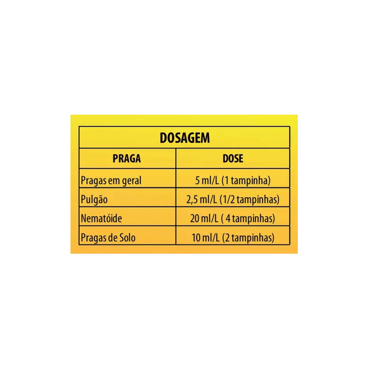 - Pulgão: 2,5ml/L (1/2 tampinhas)