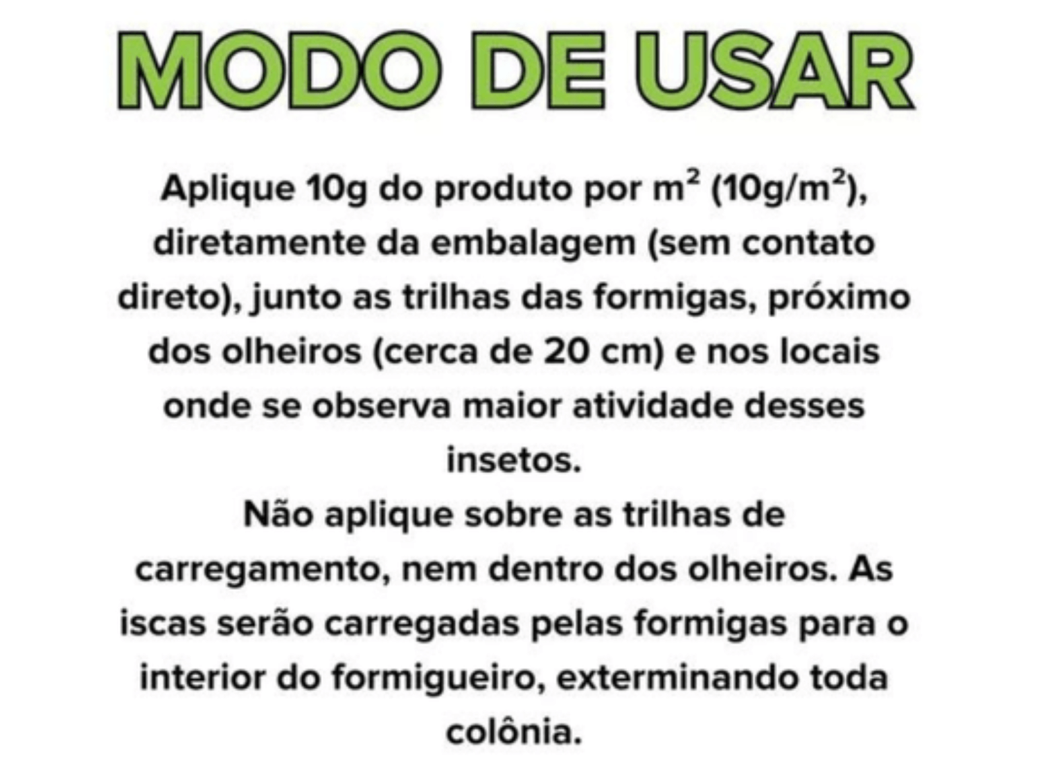 Aplique 10g do produto por m² (10g/m²), diretamente da embalagem (sem contato direto), junto as trilhas das formigas, próximo dos olheiros (cerca de 20 cm) e nos locais onde se observa maior atividade desses insetos.