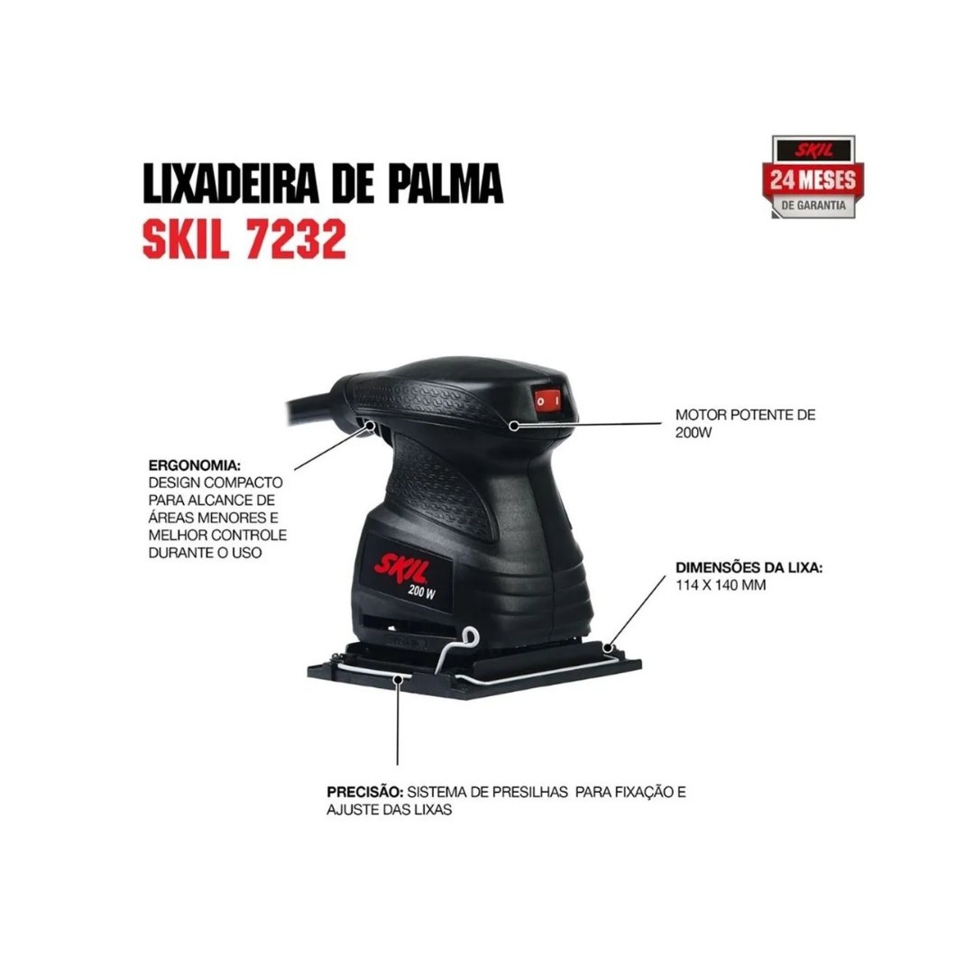 Com esta lixadeira, você conseguirá um trabalho de maior qualidade, pois ela permitirá que você realize o lixamento de diferentes materiais com o melhor resultado. Consiga detalhes exclusivos! Praticidade e versatilidade em uma única ferramenta. Com a lixadeira Skil 7232 você conseguirá trabalhos com um acabamento mais fino e alcançará locais apertados e de acesso difícil. É uma ferramenta compacta, versátil e com design ergonômico, o que oferece mais controle e conforto. Ideal se a sua atividade principal é a carpintaria!