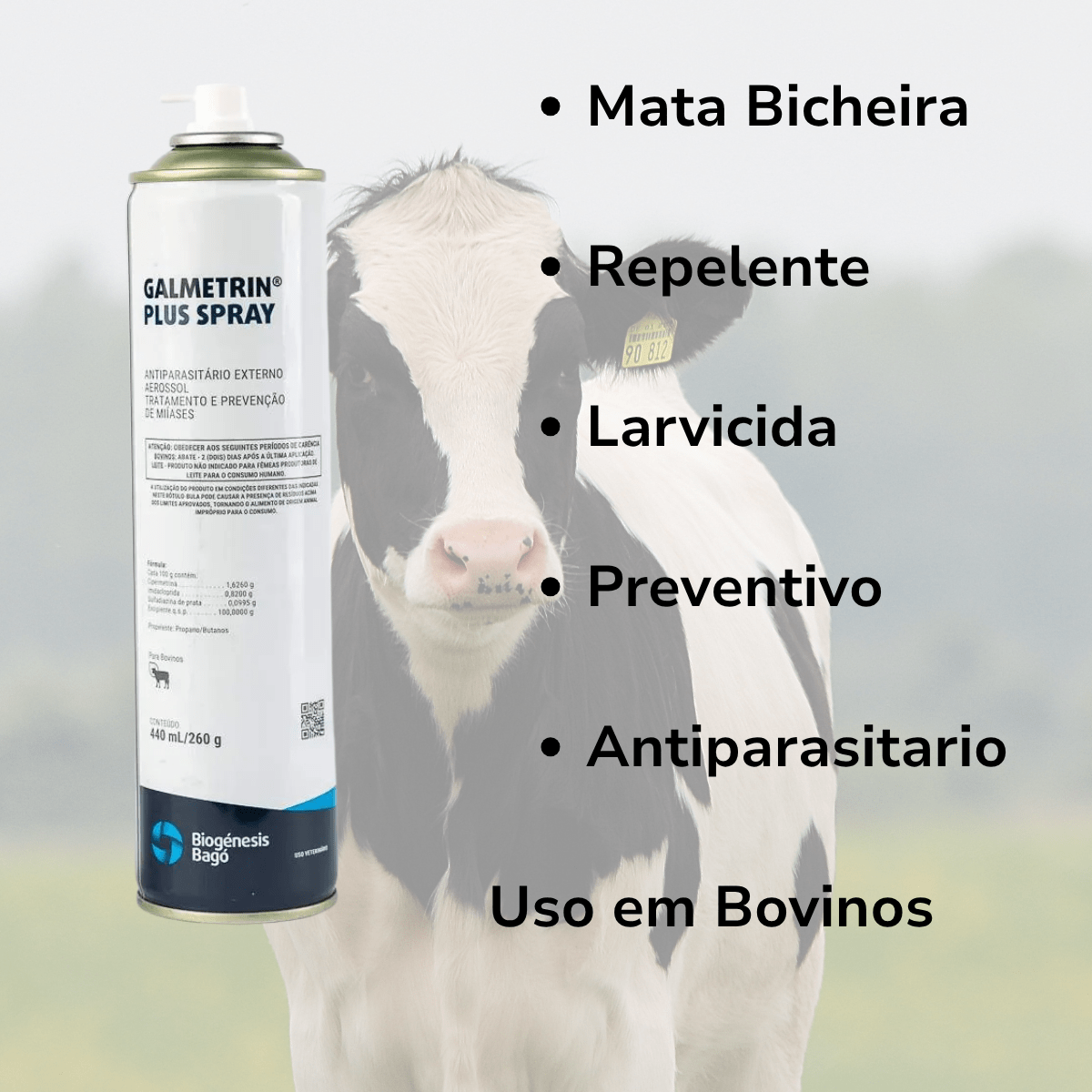 Mata Bicheira -Galmetrin Plus Spray é indicado especialmente para combater as “bicheiras” (miíases), com ação residual durante 12 dias, contra as larvas de mosca causadoras de miíases (”Cochliomyia hominivorax”). Indicado para a espécie bovina como antiparasitário externo aerossol para
