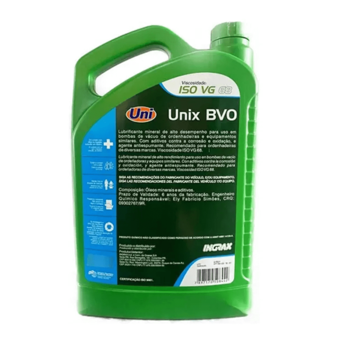 Óleo mineral de alta qualidade. Possui aditivos que lhe garantem excelente proteção contra o desgaste, a corrosão e a oxidação. É formulado com óleos minerais parafínicos, contém aditivos antioxidantes, anticorrosivos, antiespumantes e corante vermelho que facilita a sua identificação, ou um possível vazamento. ISO-VG 68Unix BVO é um óleo mineral de alta qualidade especialmente desenvolvido para lubrificação de bombas de vácuo de ordenhadeiras.