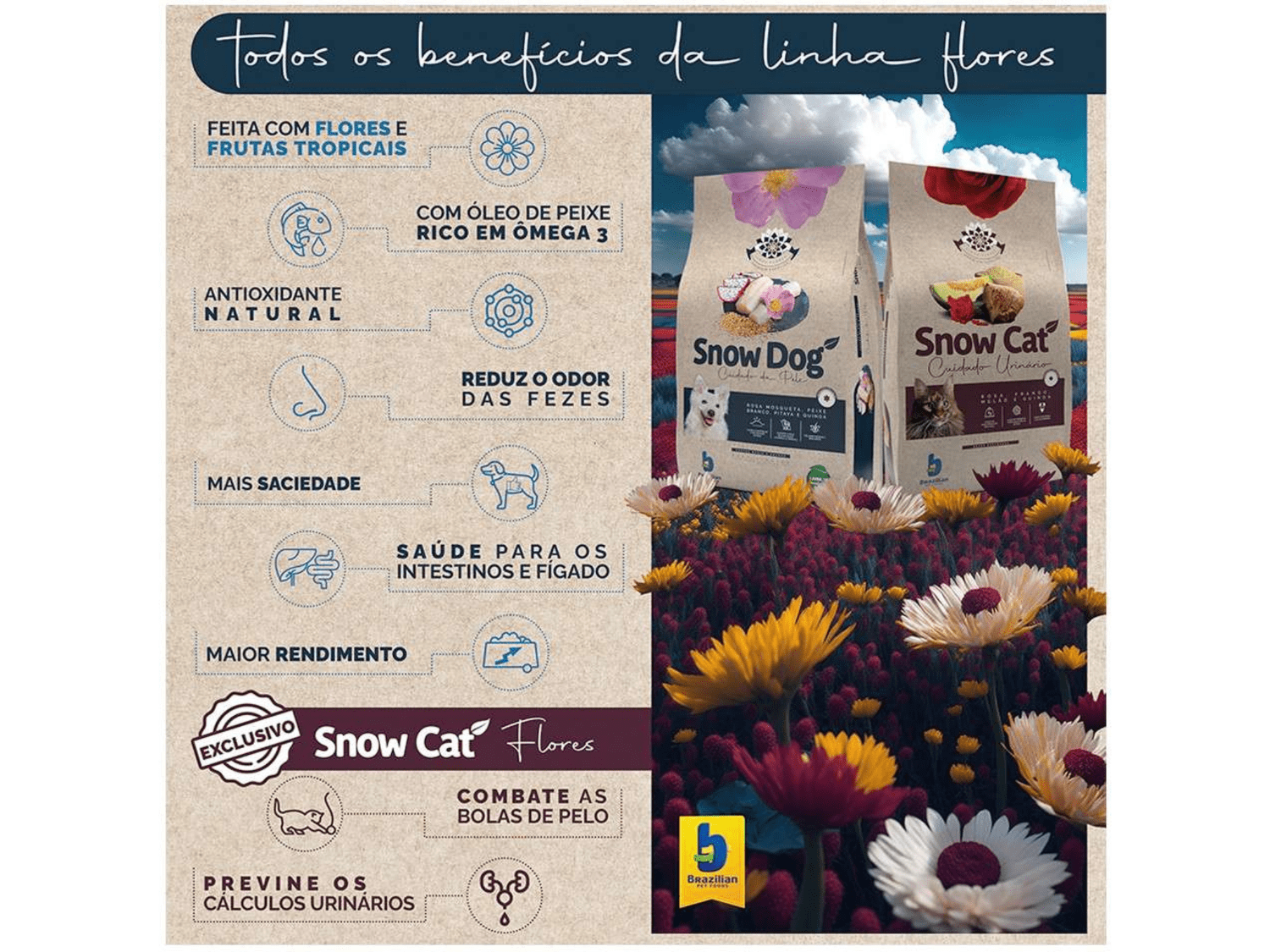 Inspirada no poder das flores, a Ração Seca Snow Dog Flores Longevidade para Cães Adultos Porte Médio e Grande é especialmente formulada para proteger contra o envelhecimento precoce, fortalecer as defesas naturais e promover a saúde do coração, rins e articulações.