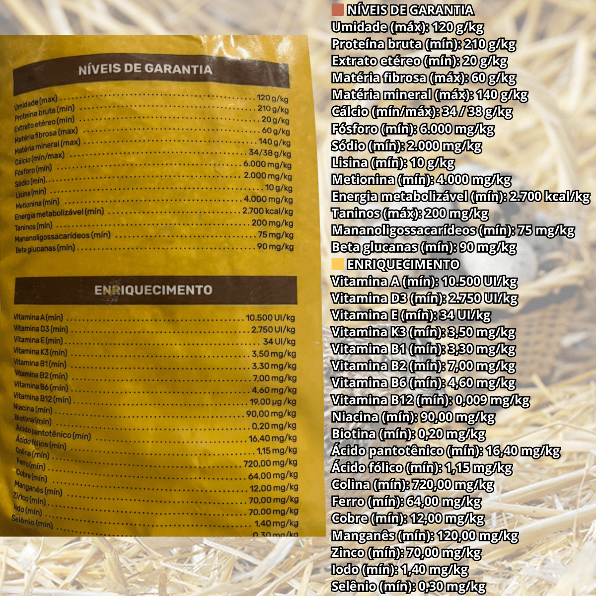 A composição inclui níveis adequados de proteína bruta, energia metabolizável, minerais, aminoácidos essenciais (como lisina e metionina) e vitaminas indispensáveis para o bom funcionamento do organismo das poedeiras. O enriquecimento com vitaminas do complexo B, A, D3 e E, além de minerais como zinco, ferro, manganês e selênio, assegura suporte imunológico, produtividade e qualidade da casca dos ovos.