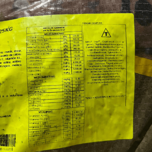 Farelo de arroz desengordurado, casca de arroz moída, farelo de trigo, milho integral moído, melaço líquido, calcário calcitico, cloreto de sódio, iodato de cálcio, sulfato de manganês, óxido de zinco, selenito, de sódio, sulfato de cobre, sulfato de colbato, sulfato de ferro, ácido pantotênico, cloreto de colina, biotina, vitamina A, vitamina B1, vitamina B2, vitamina B12, vitamina D3, vitamina E, vitamina K3, ácido nicotínico, caulim, óleo de arroz degomado, antioxidante, (BHT)e aditivo adsorvente (Bentonita).