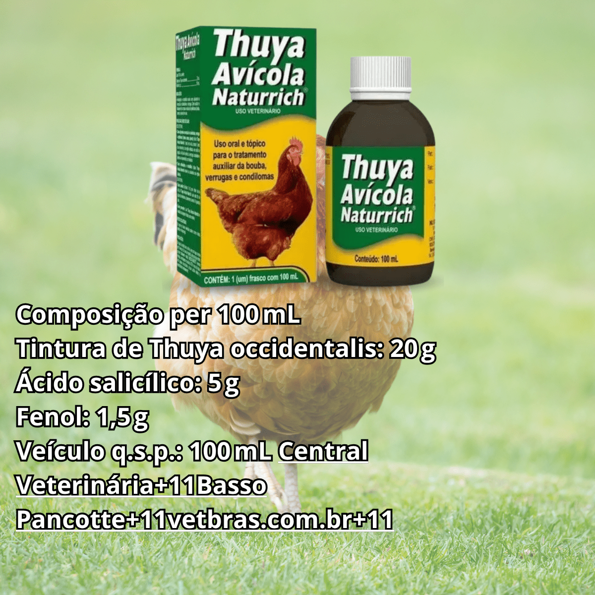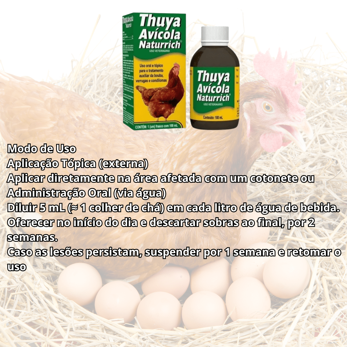 Tratamento auxiliar contra bouba aviária (pipoca), verrugas, nódulos e lesões de pele em aves domésticas e ornamentais, como galinhas, frangos, patos, perus, gansos e até avestruzes.