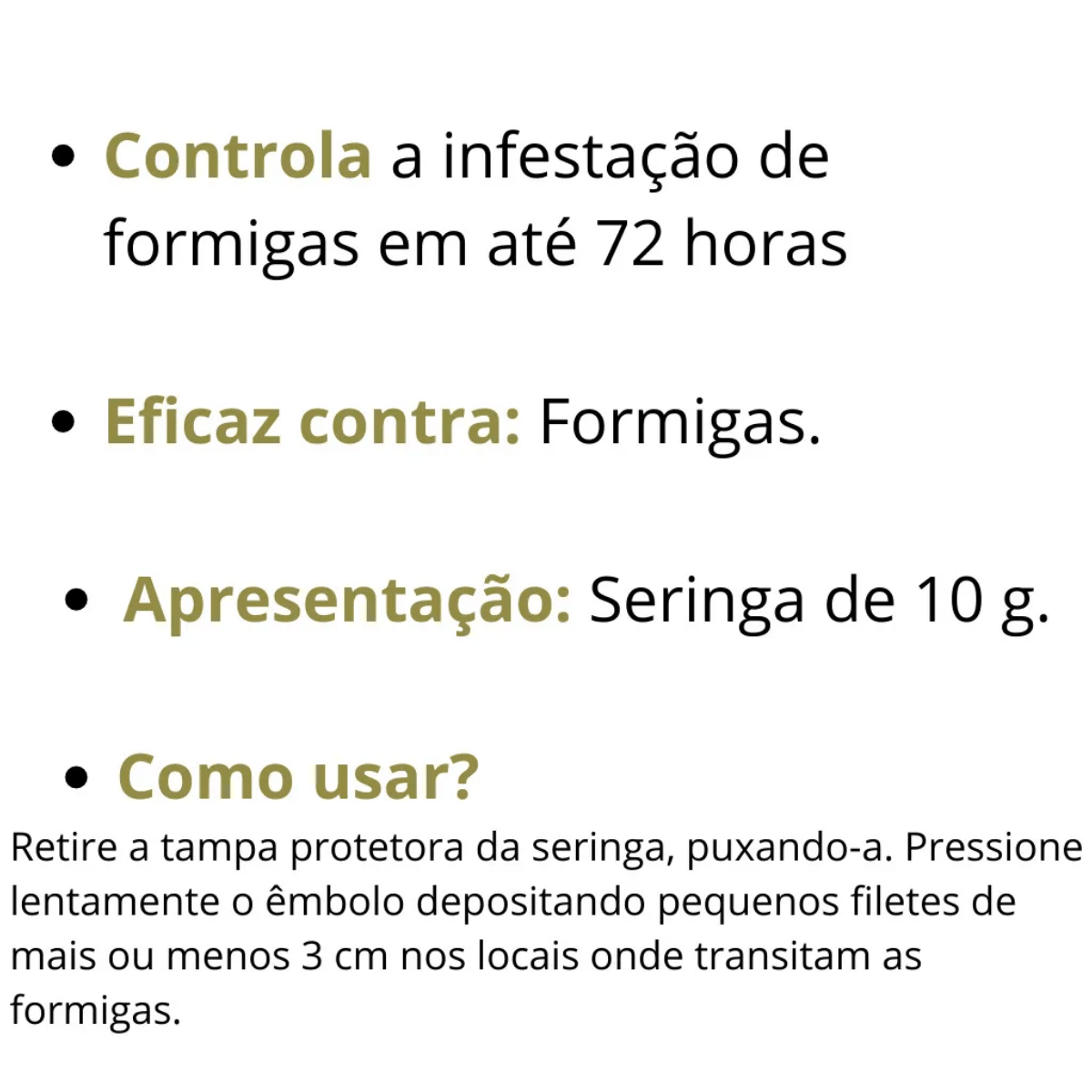 Retire a tampa protetora da seringa, puxando-a. Pressione lentamente o êmbolo depositando pequenos filetes de mais ou menos 3 cm nos locais onde transitam as formigas. Procure não interromper a trilha, pois algumas espécies podem rejeitar o produto. Após 3 dias da aplicação, o produto que não foi consumido pode ser retirado dos locais onde foi aplicado.